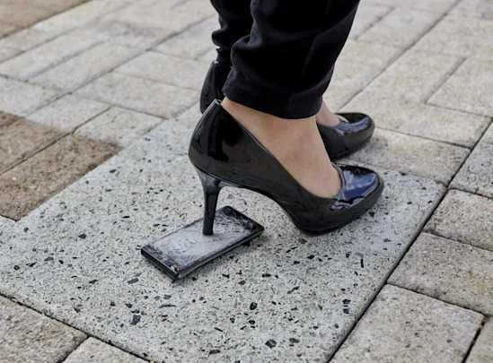 Päälle istuminen on riskialtis hetki puhelimelle, mutta päälle astuminen on jopa moninkertaisesti tätäkin riskaabelimpi tilanne, joskaan ei onneksi aivan niin yleinen. Monet meistä kuljettavat puhelinta housujen taskussa, saattaa sen unohtaminen taskuun olla kohtalokasta, sillä housujen luonnollinen säilytyspaikkahan on lattialla(?). Kun housut ovat lattialla, niin puhelin on myös, ja välillä askel saattaa osua vaatekasan päälle. Epäonnekkaissa tapauksissa puhelin jää jalan ja lattian väliin, sillä seurauksella, että suru tulee puseroon, kun huomataan näytön pirstaloituneen. Kengät jalassa tapahtuva askel on tietenkin vaarallisempi kuin sukkasiltaan, mutta kaikista pahin on kuitenkin korkokengän kanta, joka saattaa jopa lävistää puhelimen.